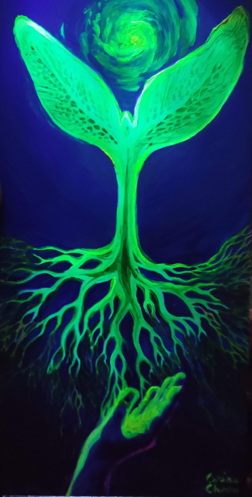 Grija este conceputul de la baza acestei picturi fluorescente, grija fata de natura, grija fata de plantele verzi, grija fata de o noua viata.