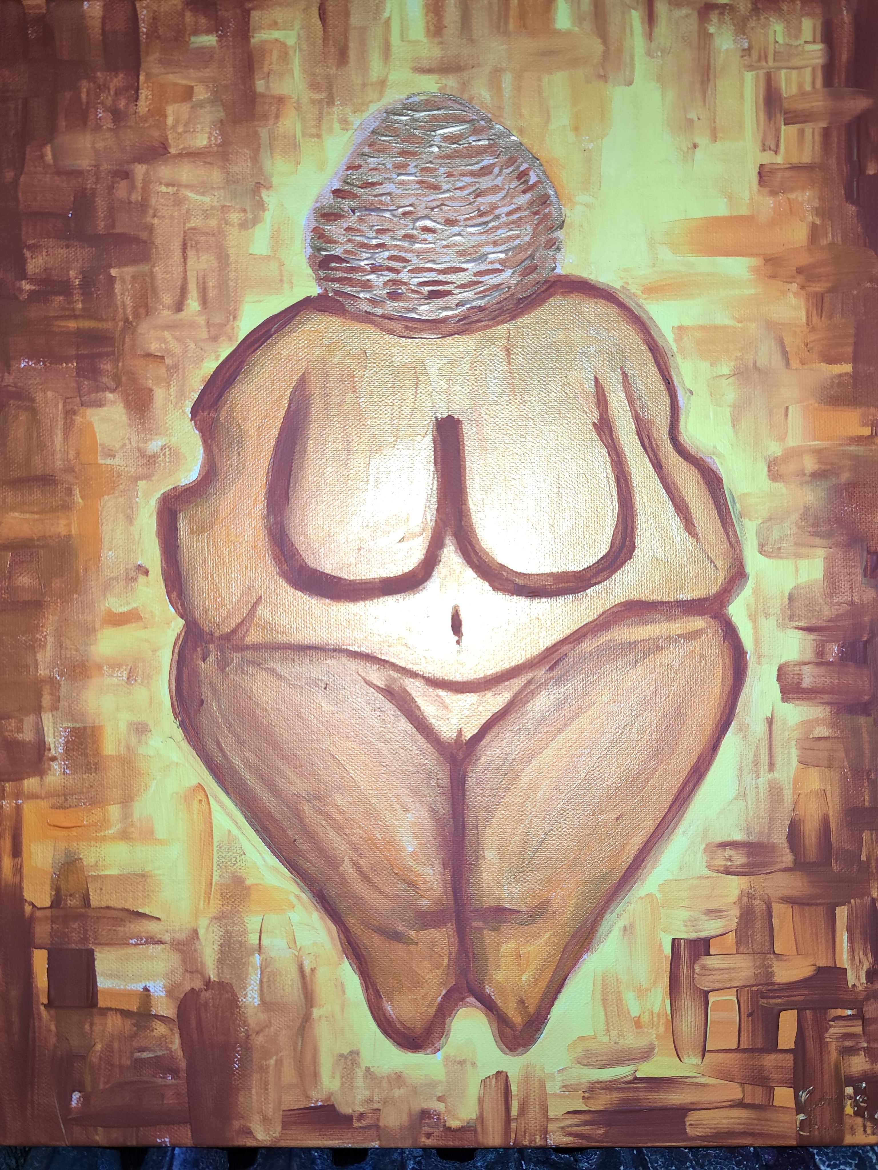 Statueta veche de 17000 de ani gasita la Piatra-Neamt m-a inspirat ca sa fac aceasta pictura reprezentand o zeita mama a unui cult matriarhal din vechime. Statueta a fost botezata in mod impropriu si neinspirat „Venus de Piatra-Neamt”, impropriu deoarece aceasta aminteste mai mult de o zeita mama si e un cult al maternitatii si al fertilitatii decat de o zeita a erotismului, cum era Venus.