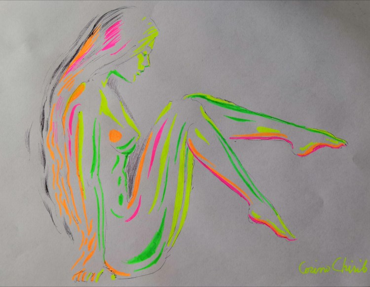 Fantezie subacvatica desen fluorescent, tehnica mixta
