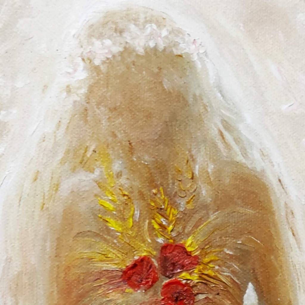 Pe 8 martie am pictat o zeita fecioara a perimaverii, o Kore, o Persephona juvenila si inocenta si mergand pe o linie diferita de ceea ce am facut pana acum am preferat sa o pictez fara chip, impersonala, misterioasa, astfel incat oricine sa se poata regasi in ea.