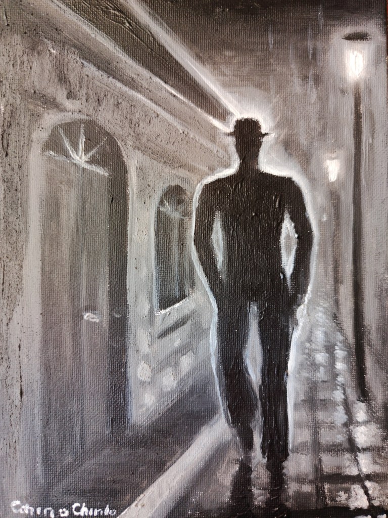 Acum cateva luni am avut o viziune. Am vazut cu ochii mintii un personaj misterios precum o umbra pe strazile unui oras, noaptea, pe ploaie, mergand singur pe langa cladirile vechi. Orasul parea sa fie Londra sau un oras din vestul Europei iar el purta pe cap o palarie. Abia zilele trecute am pictat imaginea din mintea mea, iar acum o puteti vedea in aceasta postare.