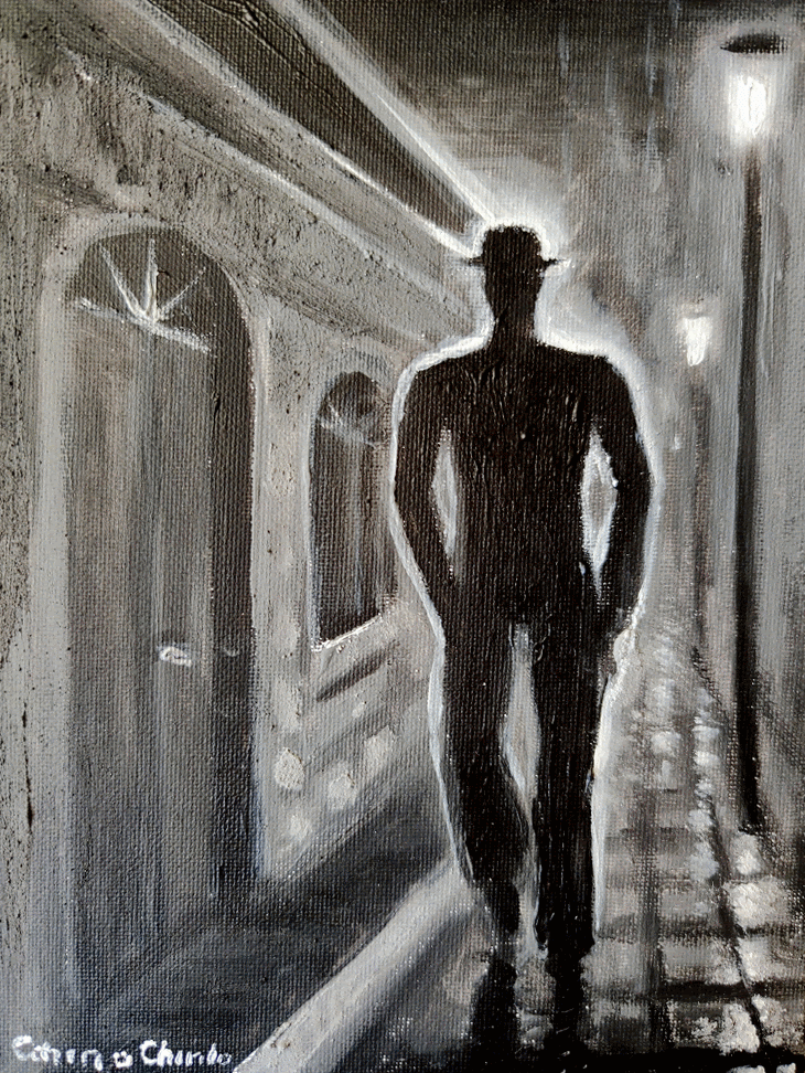 Acum cateva luni am avut o viziune. Am vazut cu ochii mintii un personaj misterios precum o umbra pe strazile unui oras, noaptea, pe ploaie, mergand singur pe langa cladirile vechi. Orasul parea sa fie Londra sau un oras din vestul Europei iar el purta pe cap o palarie. Abia zilele trecute am pictat imaginea din mintea mea, iar acum o puteti vedea in aceasta postare.