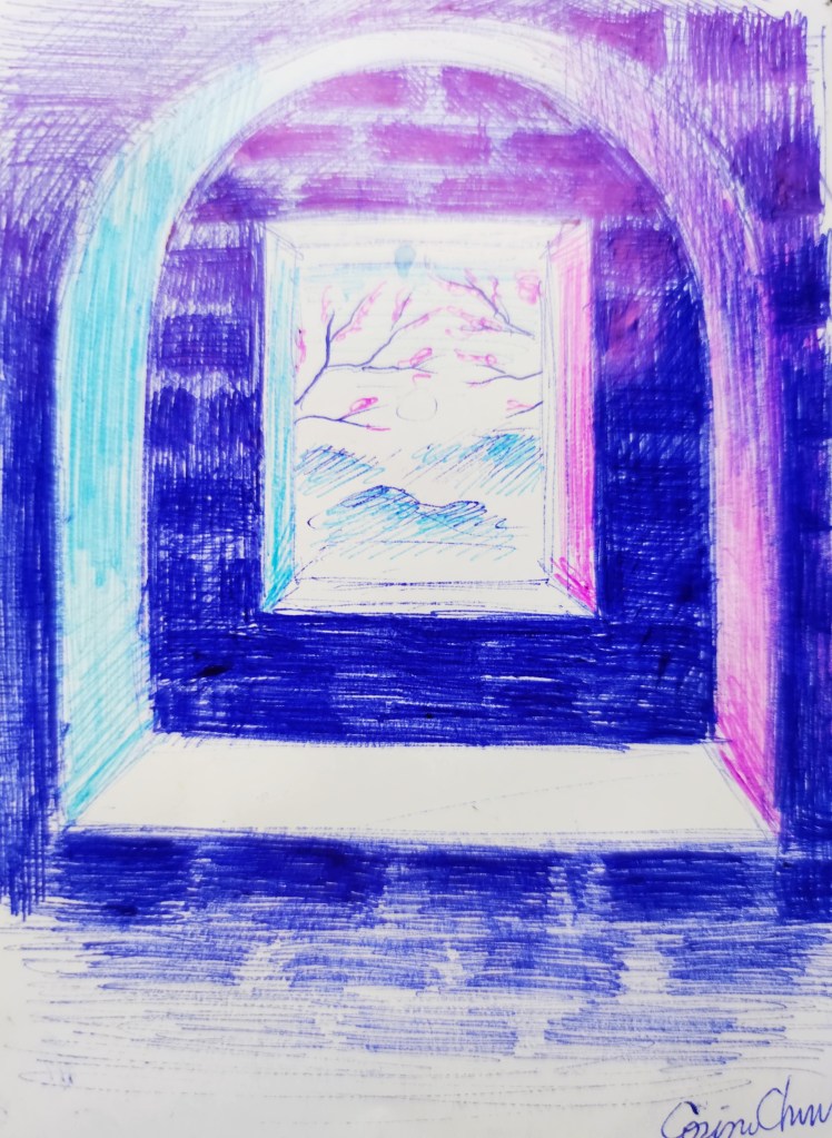 Acum in vremea izolarii si a anxietatii permanente am facut o pictura prin care am redat trairile mele din aceasta perioada. Lucrarea prezinta o imagine pe care am visat-o in aceasta dimineata. Un spatiu intunecat, o camera cu o fereastra spre o alta camera dincolo de care e o alta fereastra prin care se vede lumina de afara, lumina unei zile cu soare si cer senin, peisajul de primavara cu pomi infloriti.