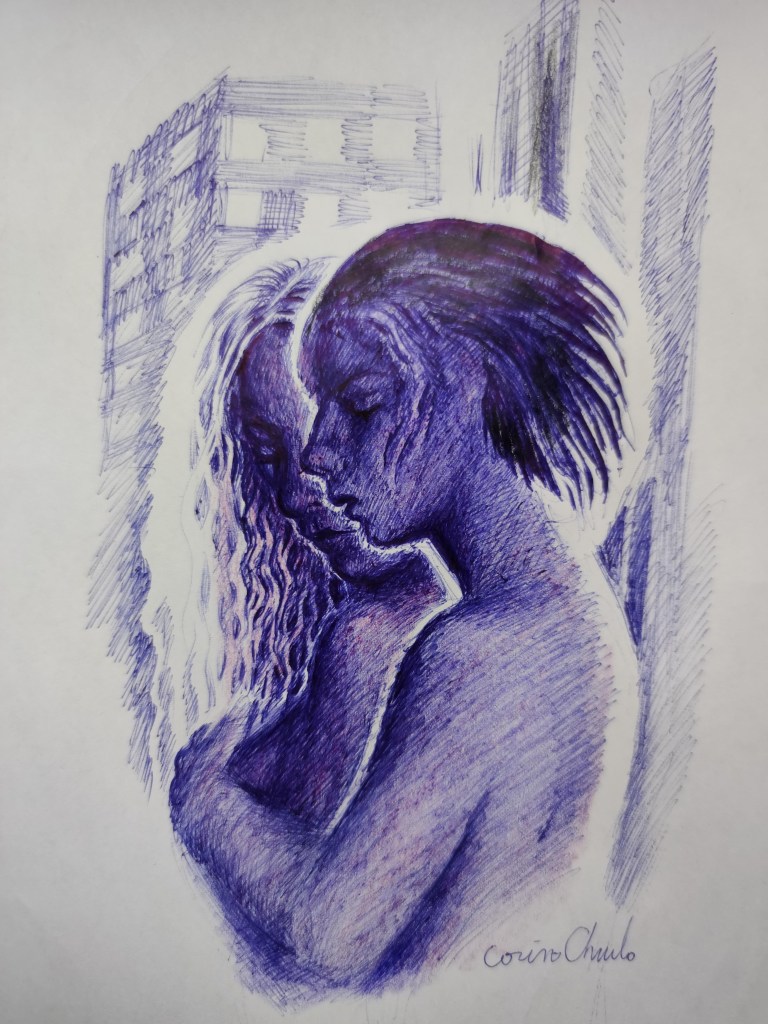 Aceste vise se tot repeta cam de o saptamana si azi m-am gandit sa desenez o imagine din visul de ieri, cand am visat ca ea se lipea de spatele meu si ma lua in brate.