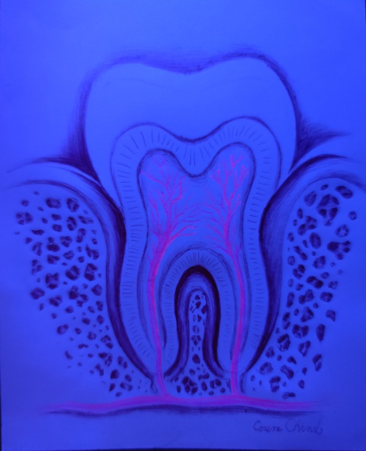 Pana acum am desenat inimi am desenat neuroni, am desenat embrioni si diverse celule țesuturi si organe da nu am desenat si nu am pictat dinti. Structura di telui lipsea din repertoriul meu artistic asa ca m-am gândit sa desez un dinte cu vase de sange in roz fluorescent