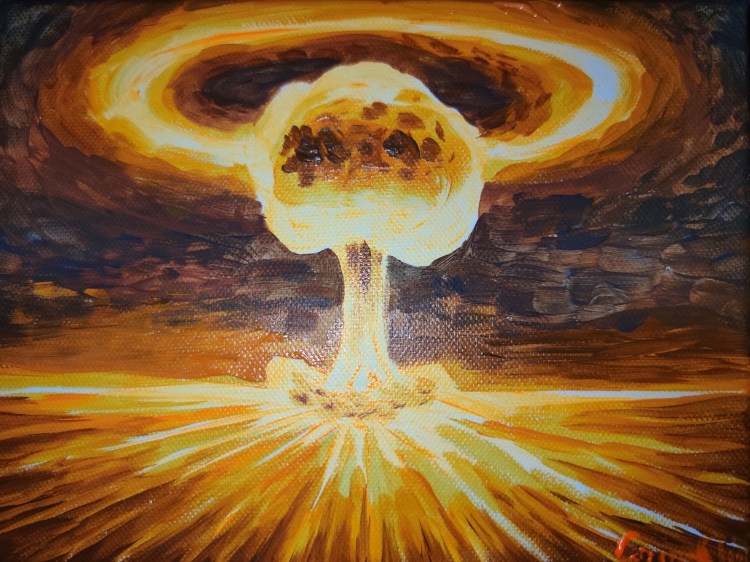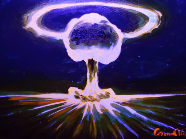 Am facut aceasta pictura plangand, cu gandul la o catastrofa care deocamdata a avut loc doar in visul meu dar nu se stie ce ne rezerva viitorul atata timp cat al treilea razboi mondial deja a inceput prin metode neconventionale cum ar fi razboiul economic si razboiul biologic.