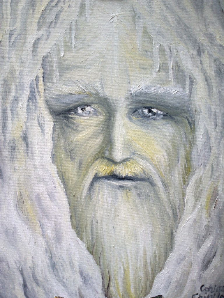 Un dac tarabostes fata in fata cu sfinxul din Bucegi, o pictura in ulei pe panza prin care am evidentiat asemanarea dintre sfinxul dacic din Bucegi si un dac tarabostes