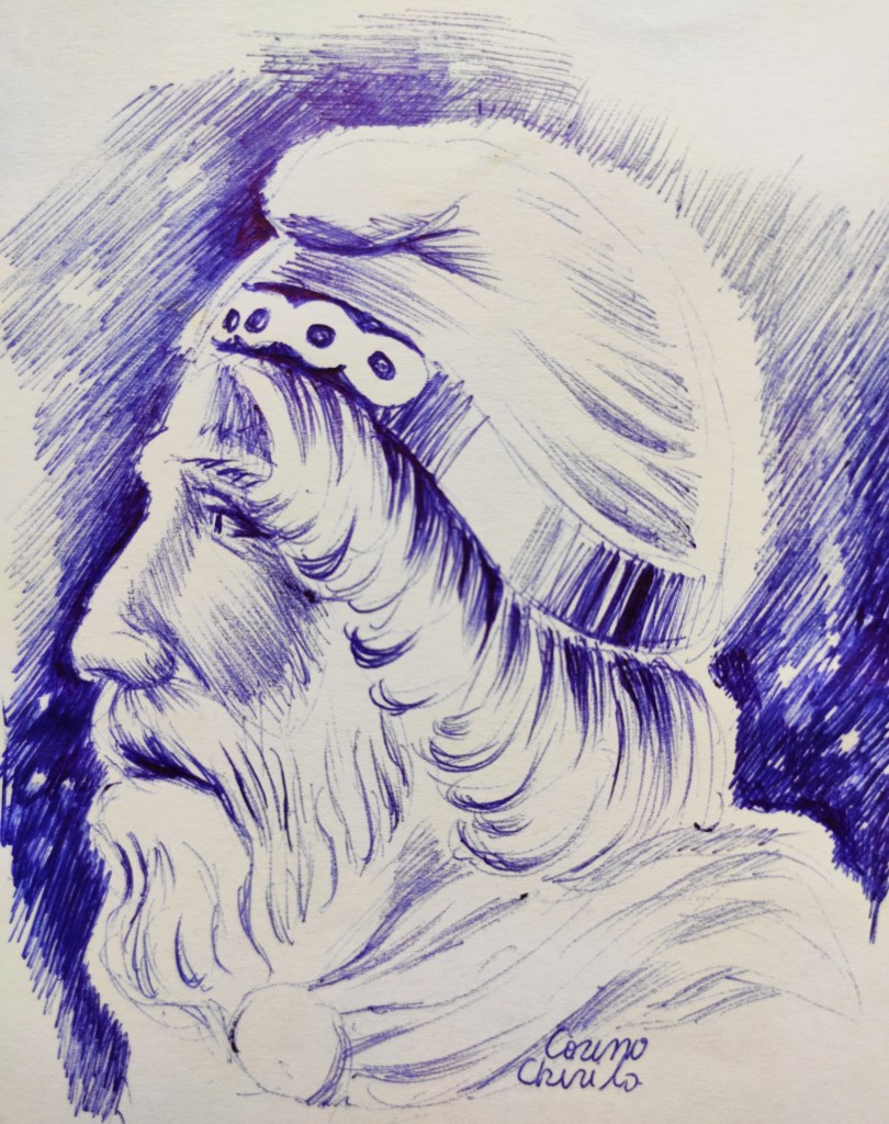 Zamolxis xu mainile spre cer in fara sfinxului dacic din Bucegi, desen in pix