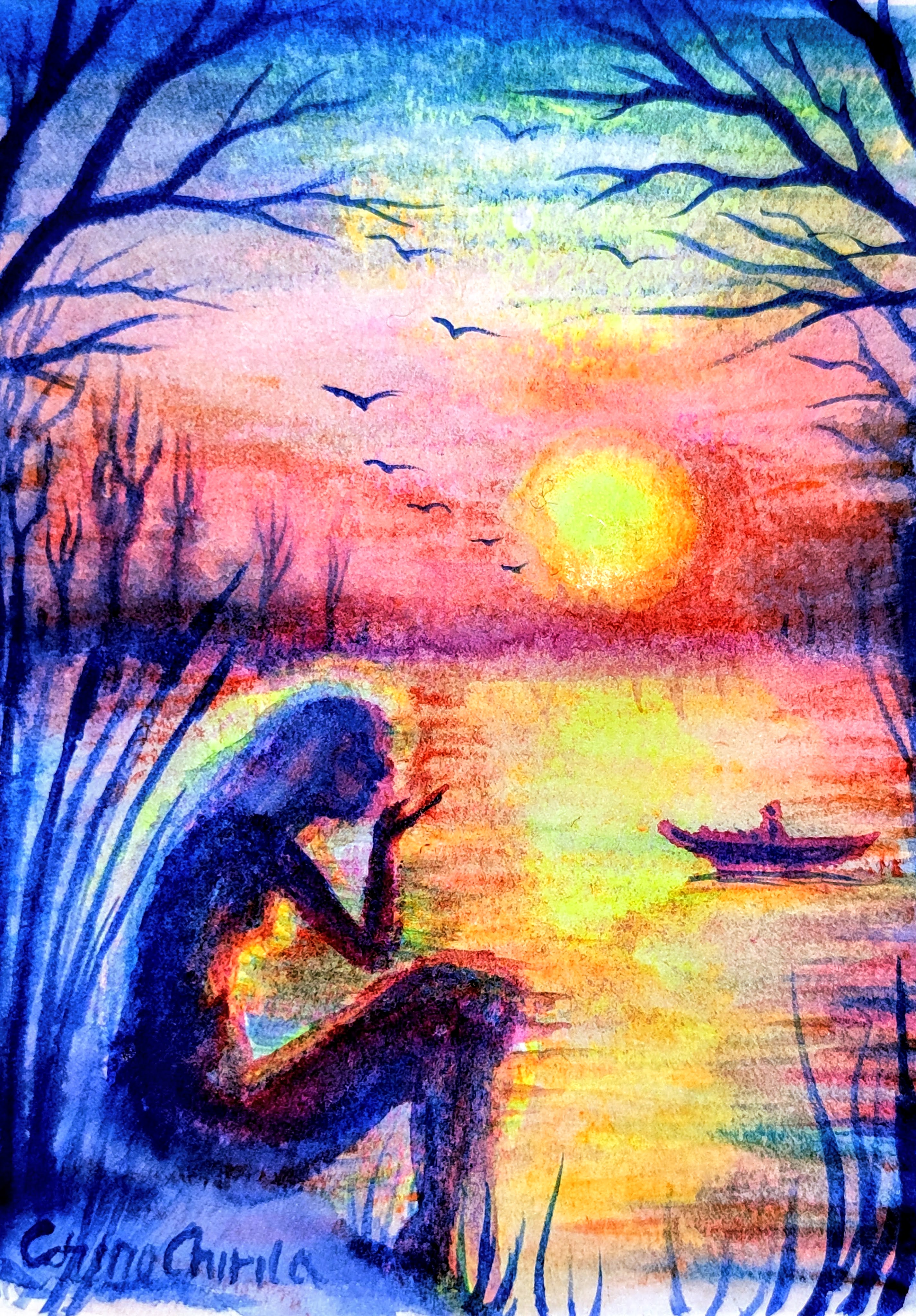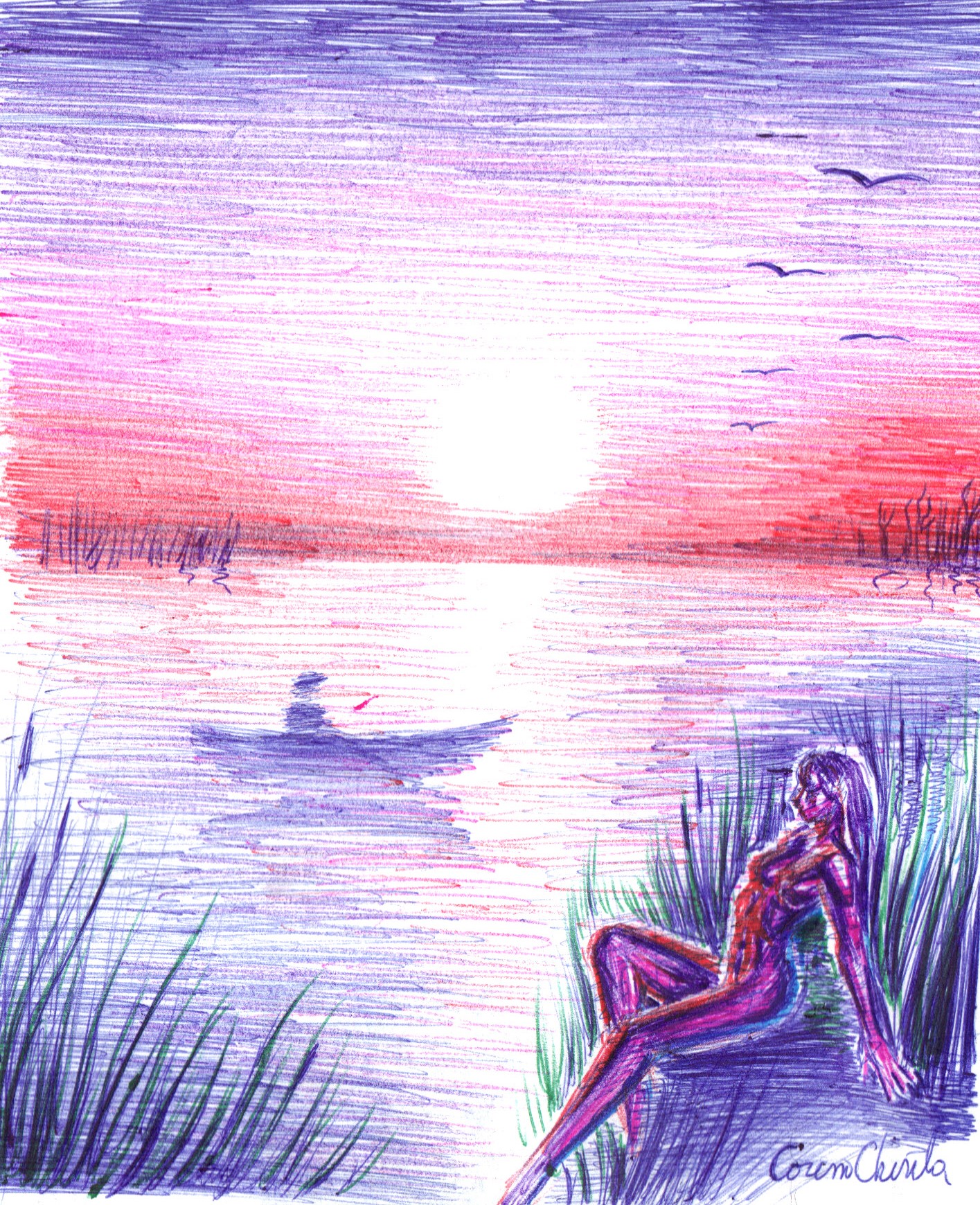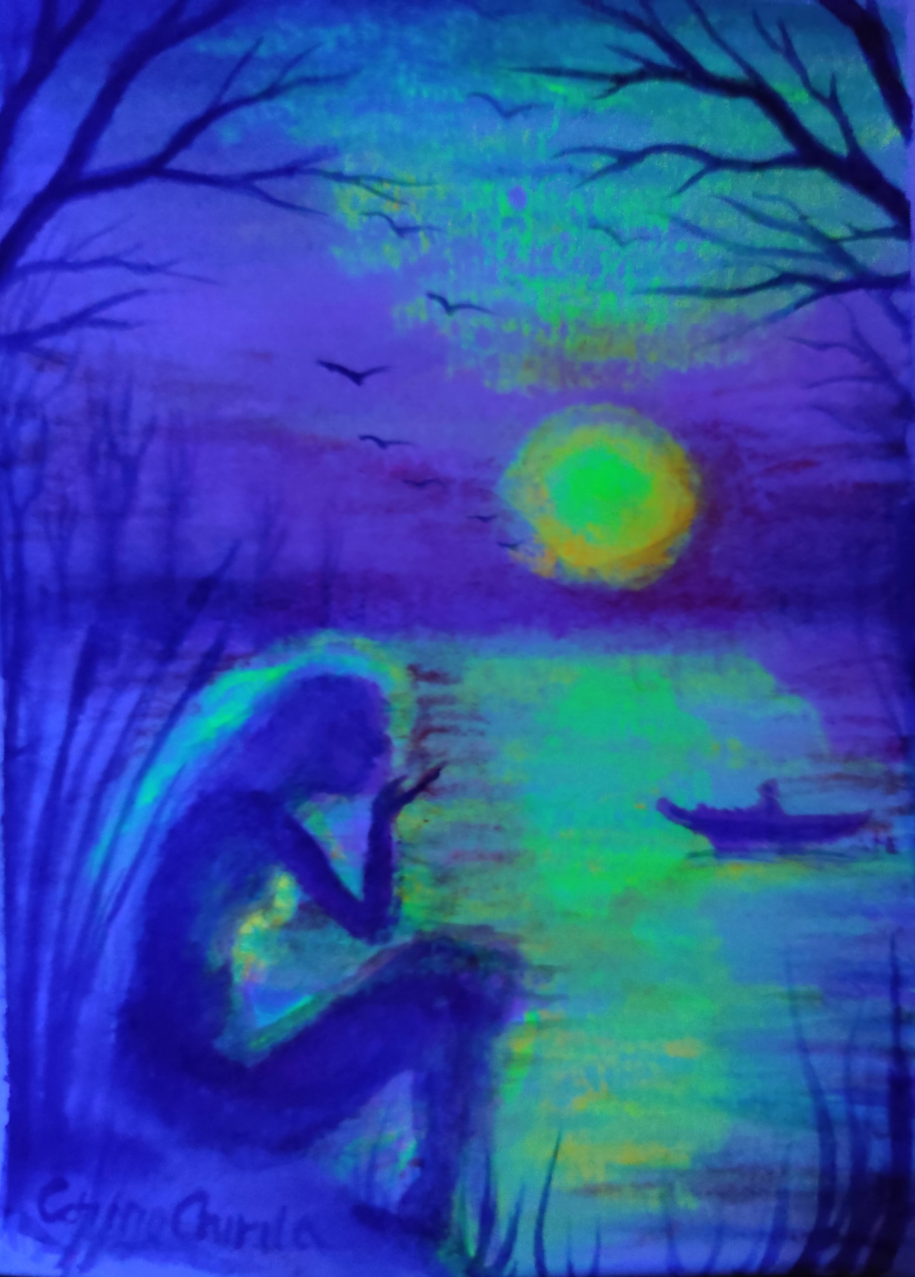 Am reluat aeasta tema iar mai jos e ceea ce a iesit, un desen in culori fluorescente prin care am surprins momentul in care soarele apune si o fata sta pe mal si isi asteapta fiinta iubita