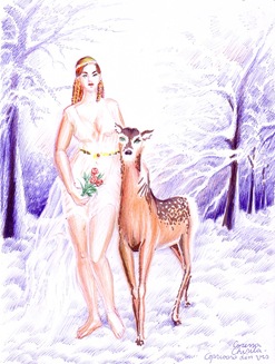Acea imagine, vânătorul o va schiţa în câteva linii pe mânerul de fildeş al jungherului său, dar drept „căprioară în fugă săltată, întorcând capul să privească sperioasă vânătorul înmuiat de dragostea unei fecioare.”, dând astfel „pe plăseaua ce va străbate veacurile, primul contur viu al emoţiei artistice. Astfel s‑a sădit harul seminţei care va face gloria omului.”, completează povestitorul istoria visului său din poiana îngheţată sub viscol.
