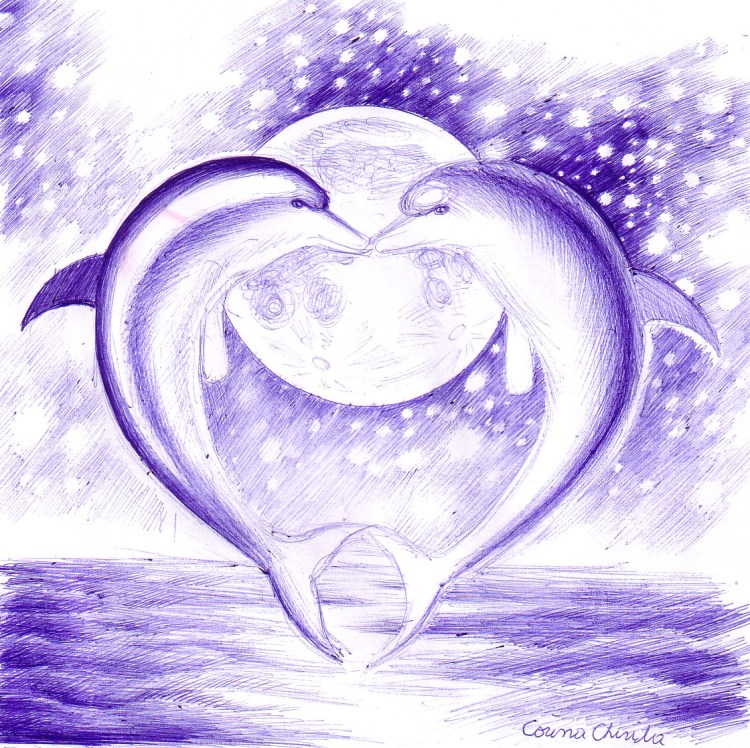 Delfini indragostiti, desen facut cu pixul