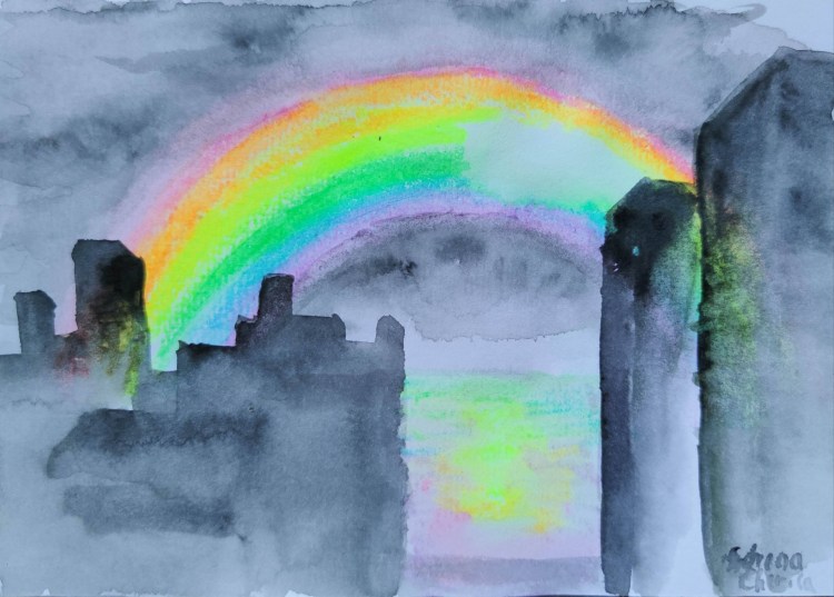 Acum cateva zile am visat ca eram undeva la bloc si parea sa fie noapte. Blocurile erau aproape de un lac sau de mare, nu iei e prea clar. Privind spre apa respectiva am vazut o lumina puternica si un curcubeu.
