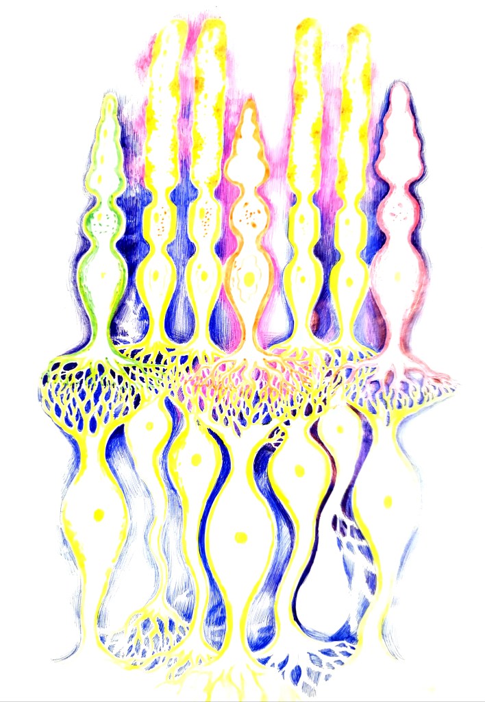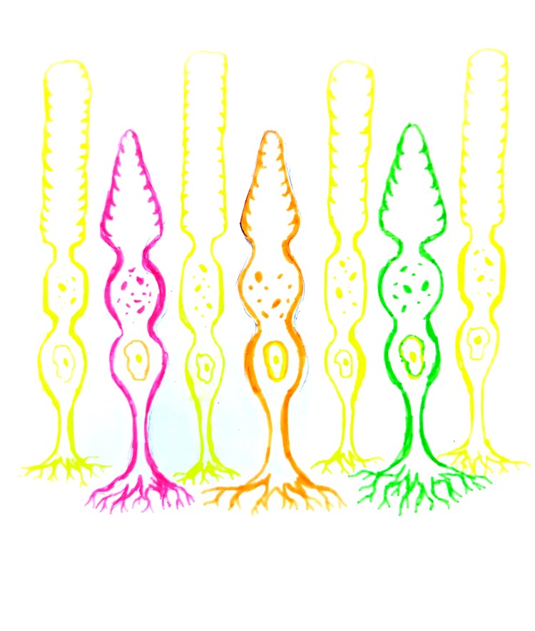 Celule cu con, celule cu bastonas si neuroni bipolari din retina, desen fluorescent in lumina ultraviolet