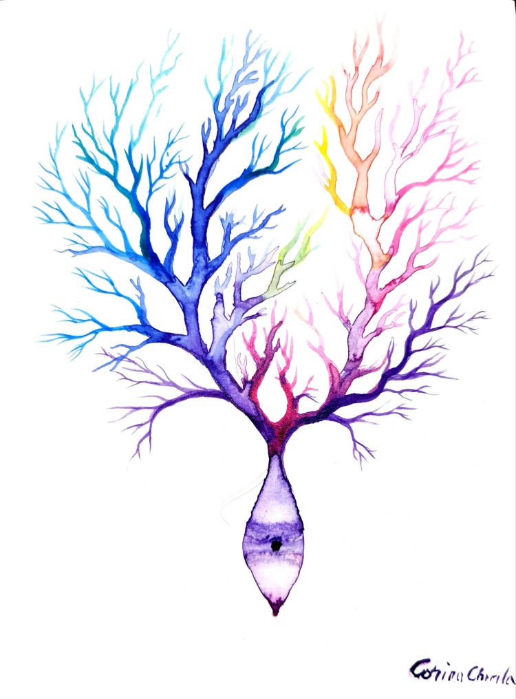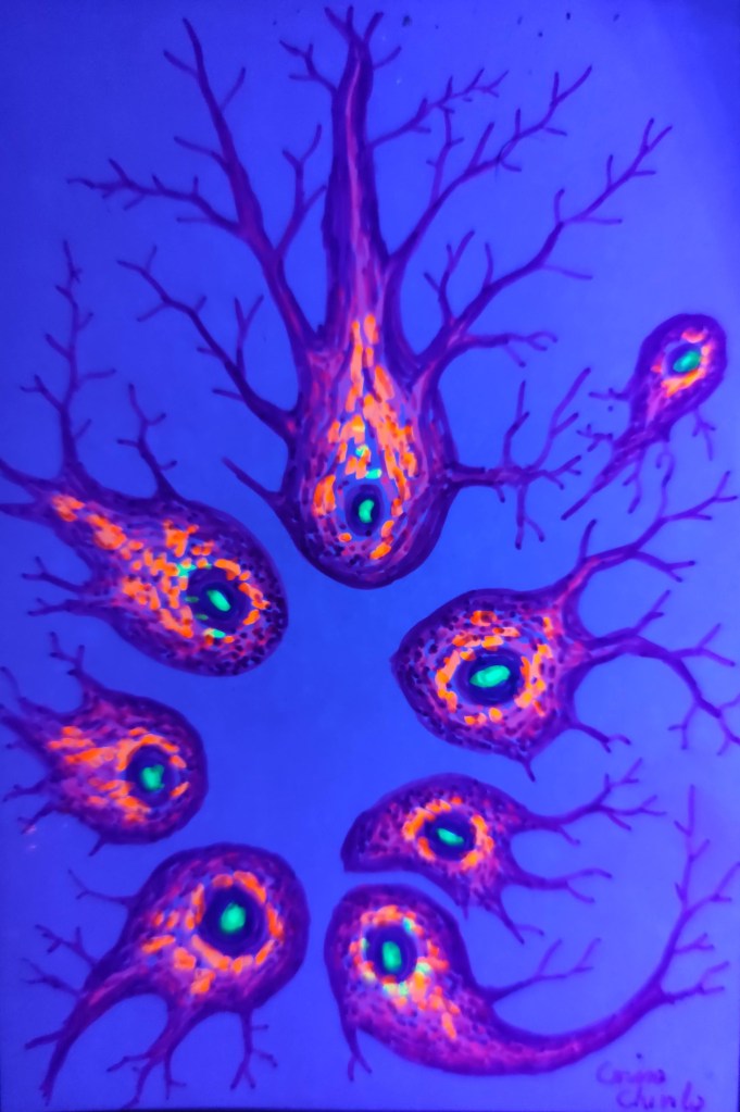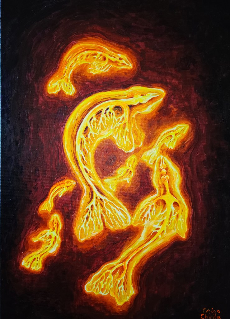 „Celulele cartilajului de sepie”, „Neuron Purkinje”, „Diviziunea celulara”, „Neurula” „Singularitate”, „Laniakea” si „Gaura neagra din centrul galaxiei noastre” sunt doar cateva dintre lurarile mele cu tematica stiintifica, din astronomie sau biologie. Am terminat facultatea de biologie si as fi putut fi profa plictisitoare de bio de care fiecare elev arde de nerabdare sa scape ca sa rupa usa si sa ajunga mai repede la minge dar am fugit mereu de invatamant ca dracu de tamaie. Prefer sa atrag tanara generatie catre stiinta intr-un mod mult mai placut, prin arta mea postata pe internet pentru ca stiu ca scoala e ultimul loc unde copilul se duce de placere si ca sa descopere pasiuni si interese noi, iar proful sau profa e ultimul om pe care acesta l-ar lua ca model. Se face stiinta in scoala dar elevul ajunge sa fuga de stiinta tocmai pentru ca ii este bagata pe gat la scoala.
