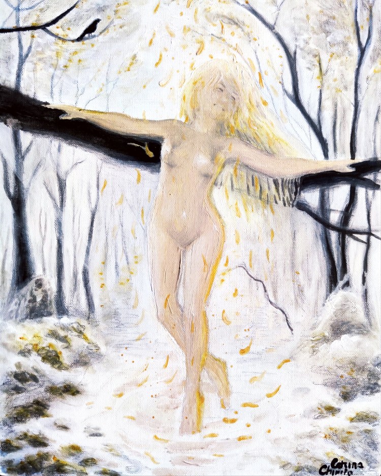 Poezia Freamat de codru a lui Mihai Eminescu a fost sursa de inspiratie pentru o intreaga serie de desene si picturi din care face parte si lucrarea de mai jos.