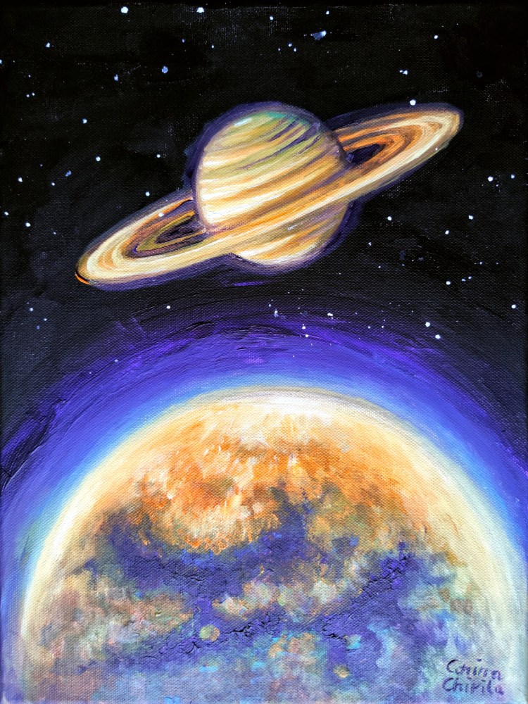 Planeta Saturn si satelitul sau, Titan, pictura acrilice pe panza