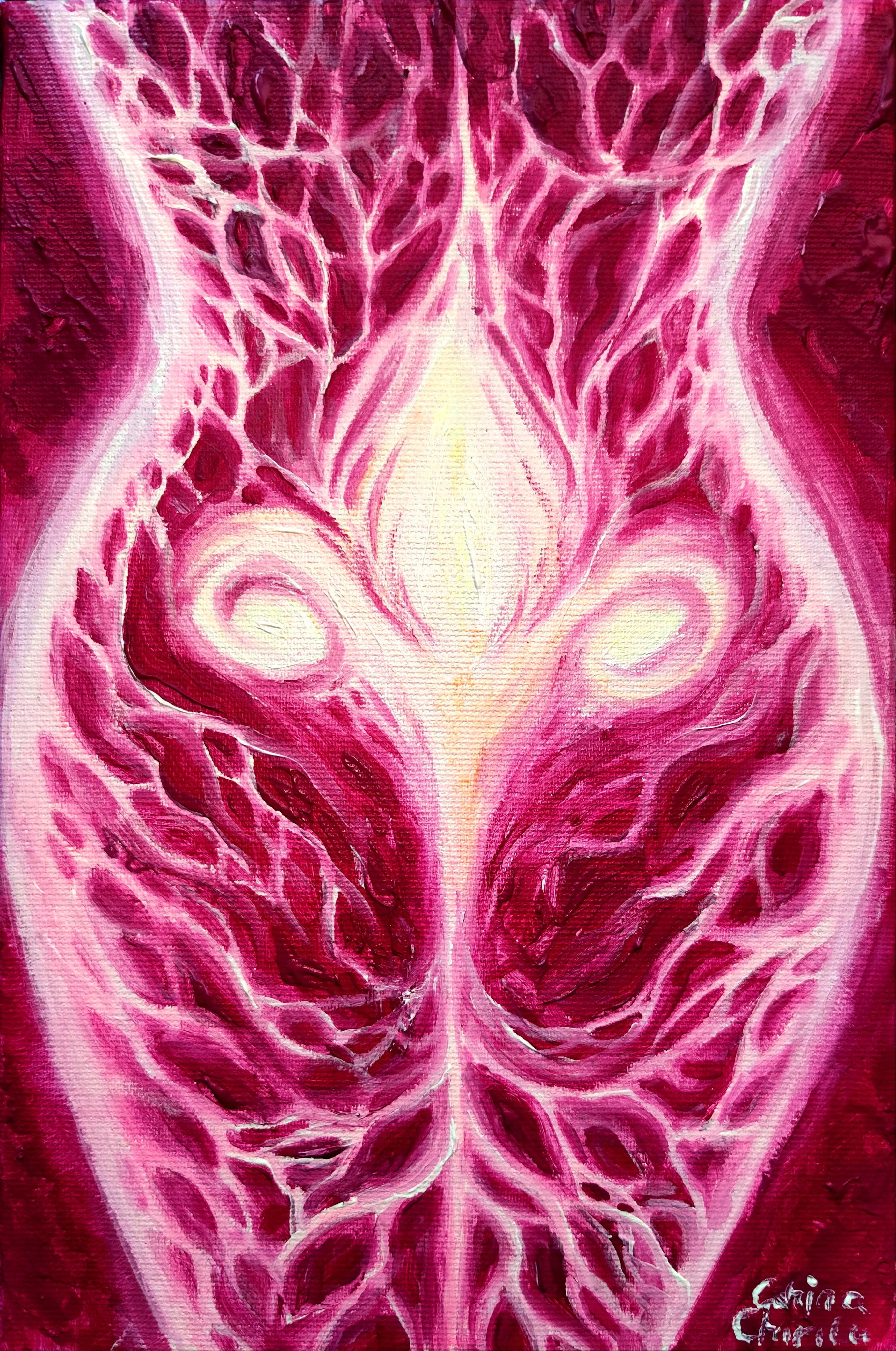 Doar noi femeile stim cum stam chircite si ne tavalim pe jos de dureri in fiecare luna. Doar noi stim prin ce dureri trece o mama cand naste. Nu mai vorbesc de problemele si complicatiile care apar pe parcursul sarcinii. Cateodata sunt invidioasa pe gaina mea care face oua si cloceste si nu trece prin chinurile sarcinii si ale nasterii. Specia noastra are o mare problema cu reproducerea. Ne reproducem greu si cu multe riscuri si din acest motiv, spre deosebire de femelele altor specii, cele mai multe femei ar avea probleme grave sau ar putea sa si moara la nastere in absenta asistentei medicale, cum se intampla acum 6000 de ani, cand majoritatea femeilor mureau pana la 30 de ani, in cele mai multe cazuri fiind vorba de complicatii post partum. Pantecul da viata dar si durere si asta e ceea ce am vrut sa redau prin aceasta pictura, sacrificiul femeii, flacara unei noi vieti ce o mistuie din interior, Ea se sacrifica, isi sacrifica corpul, isi sacrifica frumusetea, isi sacrifica cariera, isi sacrifica timpul liber renuntand la ceea ce ii place pentru a da viata unui copil.