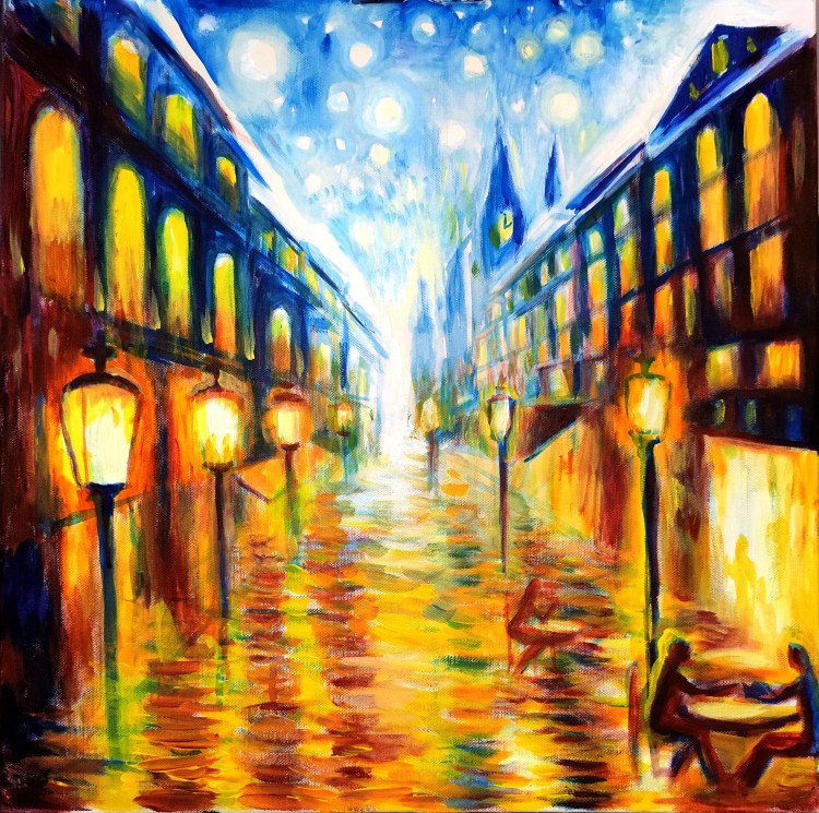 Ieri am pictat un peisaj urban, o strada cu cafenele din centrul unui oras. Am realizat pictura in centrul vechi, la Market Bazar, pe strada Franceza nr 9.