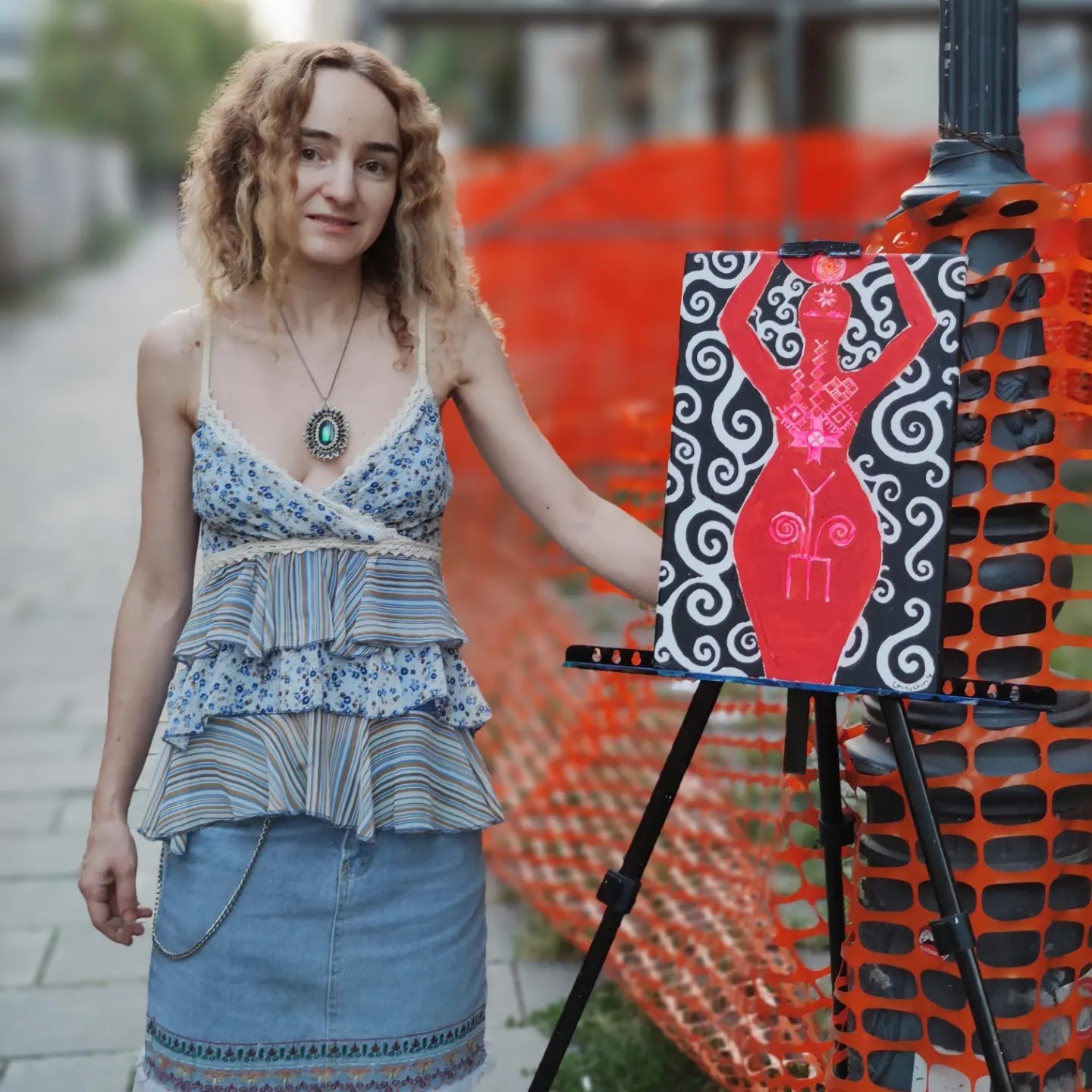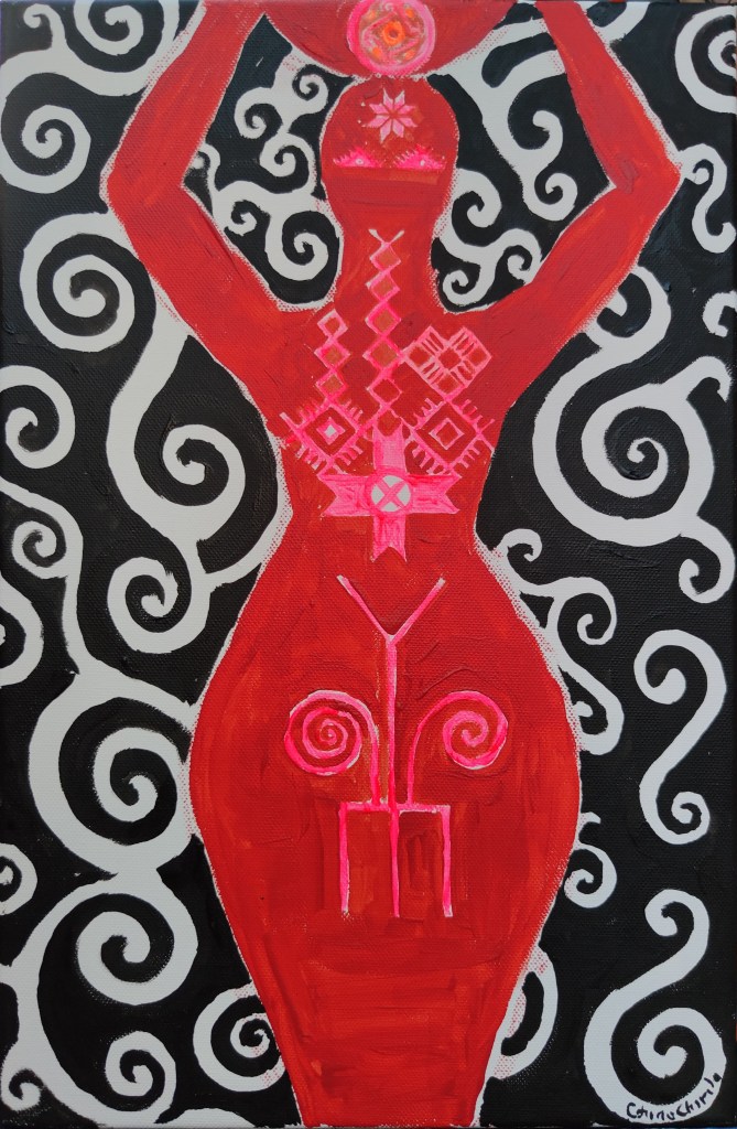 Am facut aceasta pictura saptamana trecuta la Market Bazar (str Franceza nr 9) Prin aceasta lucrare am incercat sa pun in evidenta legatura dintre motivele traditionale de pe iile romanesti si simbolurile vechi de mii de ani, de pe vremea zeitelor culturii Cucteni cand era matriarhat si artele infloreau intr-o lume libera si pasnica.