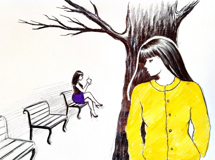 Cartea Femeia cu fusta violet scrisa de autoarea japoneza Natsuko Imamura prezinta povestea unei femei care purta mereu o fusta violet, nu avea un loc de munca si adora briosele cu crema de lapte, vazuta prin ochii altui personaj feminin, femeia cu cardigan galben care o ajuta sa-si gaseasca un loc de munca la un hotel. Pornind de la aceasta carte am facut un desen prin care am surprins cele doua personaje, femeiea cu fusta violet si femeia cu cardigan galben