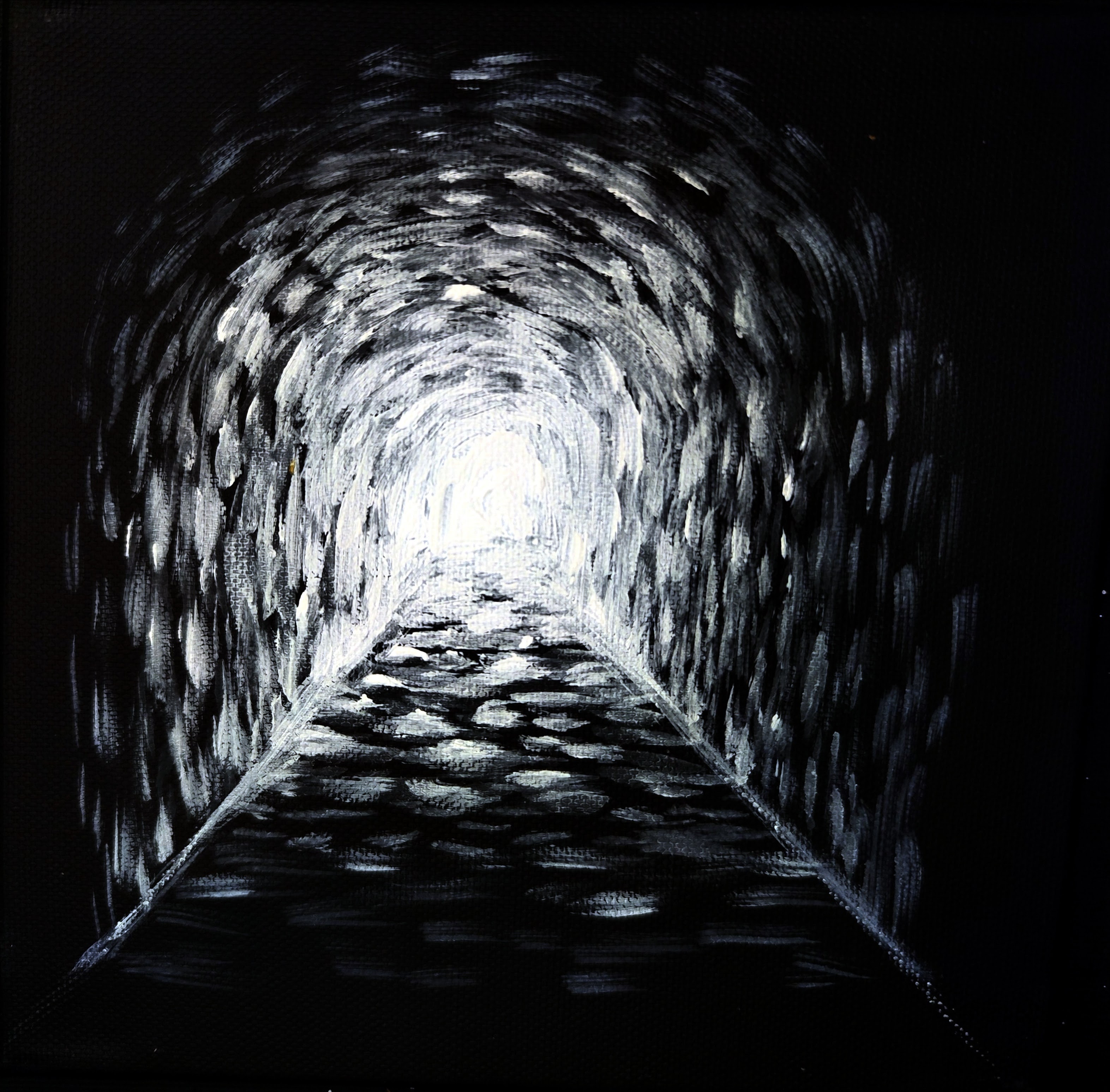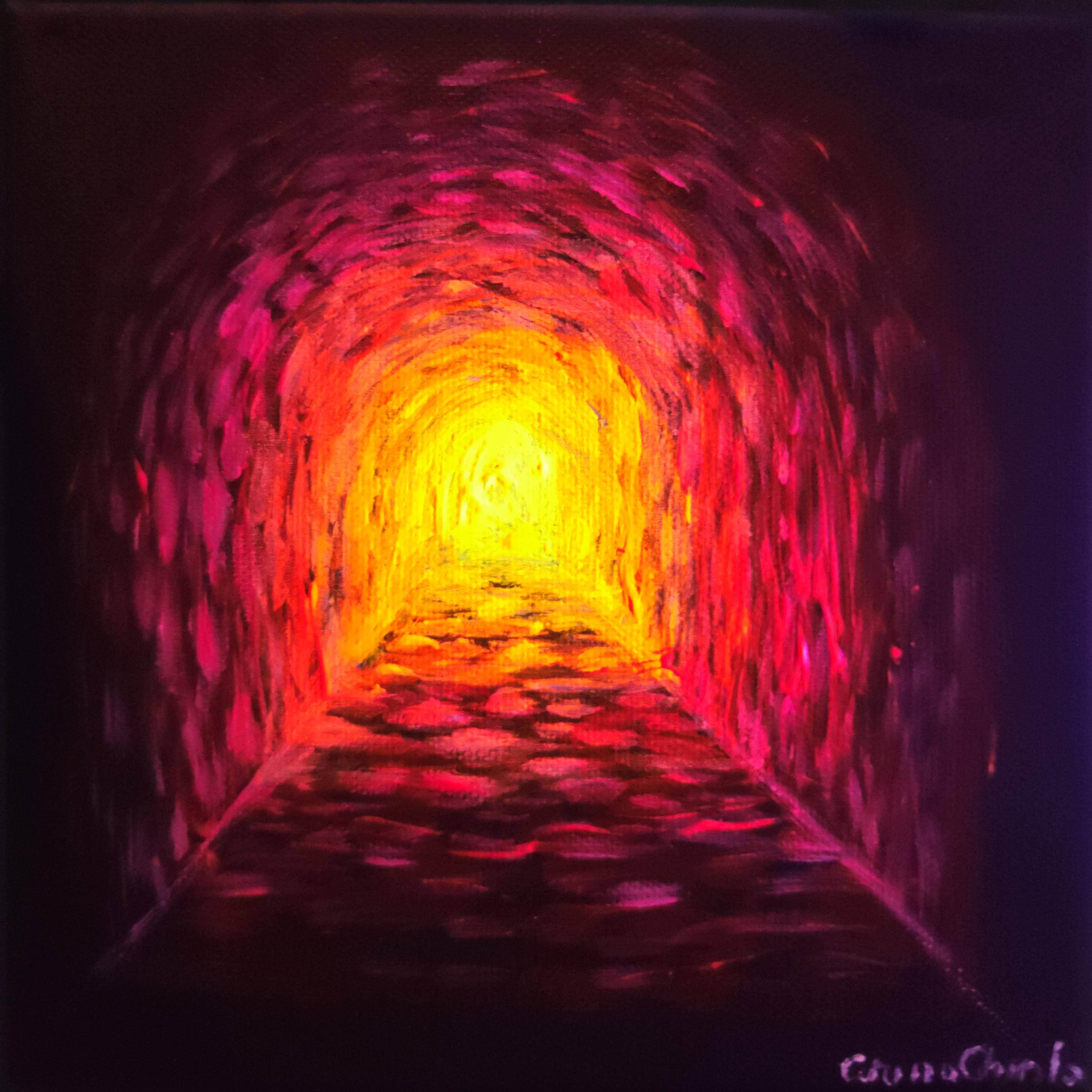 Un artist muzical din Olanda mi-a cerut sa pictez lumina de la capatul tunelului. Lucrarea pe care o puteti vedea mai sus in diferite stadii ale creatiei va insoti unul dintre albumele lui. Mai jos ma puteti vedea pictand. Am folosit o panza neagra si culori acrilice fluorescente