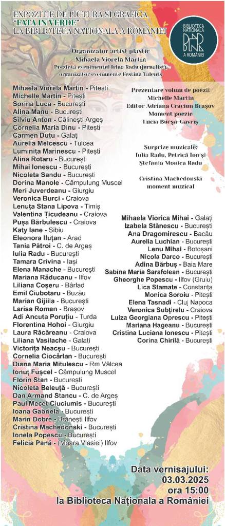 Fata in verde Desene si picturi de Corina ChirilaArta, expozitie, expozitiibiblioteca nationala, expozitie, fata in verdeLasă un comentariu 3 dintre lucrarile mele fac parte din expozitia de arta Fata in verde care va fi gazduita de Biblioteca Nationala a Romaniei incepand cu data de 3 martie Partajează asta: Dă clic pentru a partaja pe X(Se deschide într-o fereastră nouă) X Dă clic pentru a partaja pe Facebook(Se deschide într-o fereastră nouă) Facebook Dă clic pentru a partaja pe Pinterest(Se deschide într-o fereastră nouă) Pinterest Apreciază Încarc... Similare