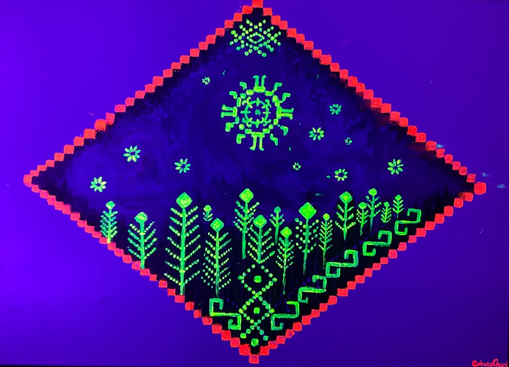 Fiecare simbol traditional romanesc este precum o litera intr-un alfabet stravechi. Ca si hierglifele egiptene aceste simboluri erau folosite pentru a comunica, pentru a transmite mesaje. Folosind limbajul simbolurilor traditionale romanesti pe care le pastram si acum pe iia romaneasca am realizat o compozitie despre graul care creste pe solul fertil (simbolizat de romb) sub soare si sub stele, totul sub privirea ochiului din cer. Din lucrarea mea face parte si dubla spirala, simbol al continuitatii vietii Pictura fluorescenta in acrilice pe panza face parte din expozitia de arta Traditional romanesc de la Atrium house unde poate fi vazuta pana pe 25 aprilie