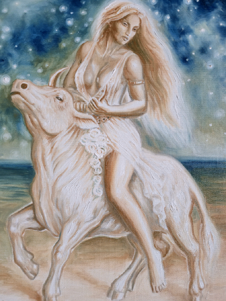 In mitologia greaca taurul il reprezinta pe Zeus transformat intr-un taur pentru a seduce printesa Europa. Aceasta este pictura mea in ulei pe panza prin care am surprins rapirea Europei