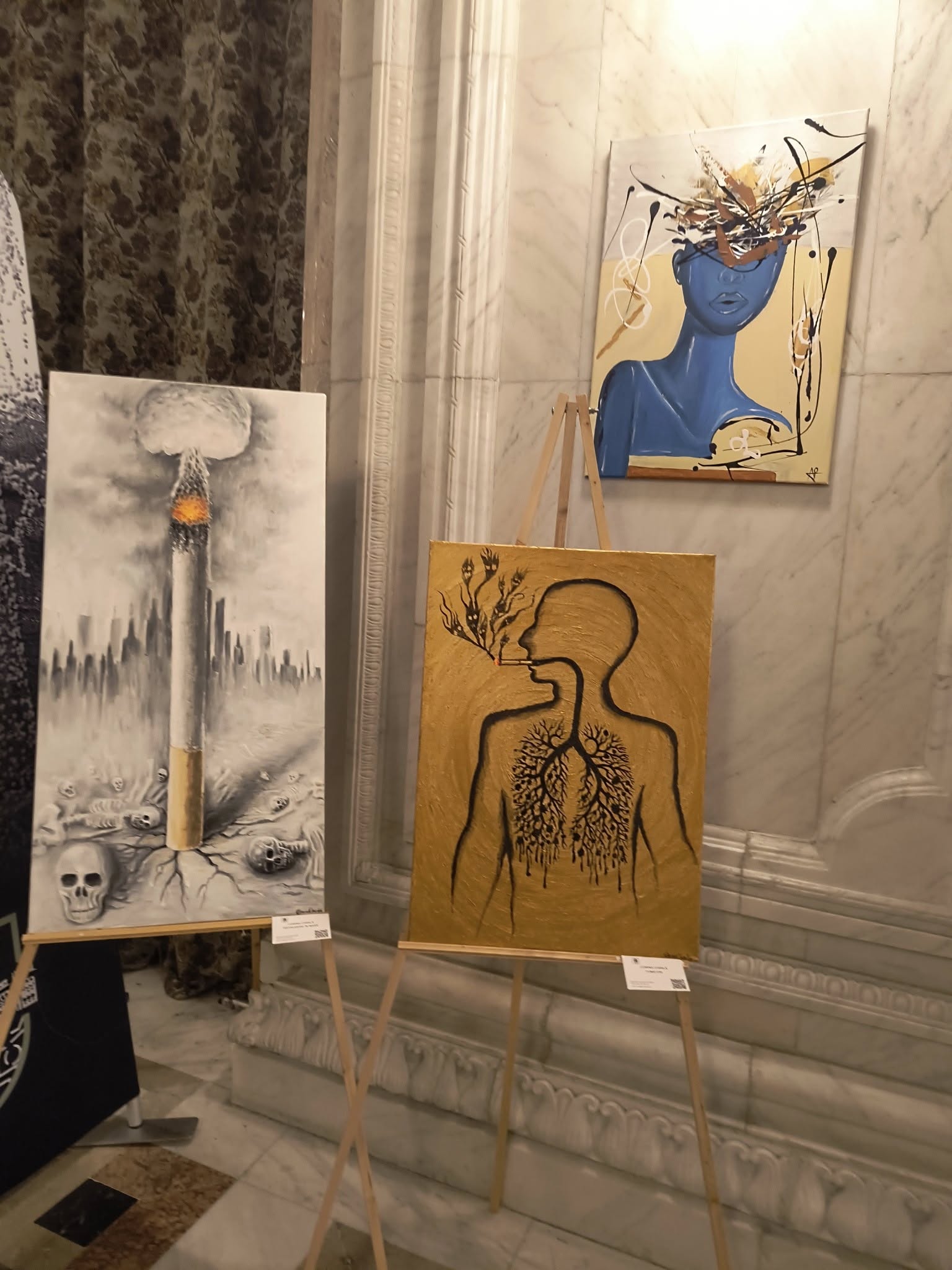 Expozitia de arta Re(rezentari) de la senatul Romaniei include 2 dintre lucrarile mele despre cea mai nociva arma de distrugere in masa si cea mai criminala inventie din istoria omenirii, tigara. Tigara mi-a ucis un numar destul de mare de rude si prieteni si mi-a imbolnavit mama iar acest lucru m-a determinat sa pictez aceste lucrari. Lucrarile pot fi vazute pana pe 30 noiembrie