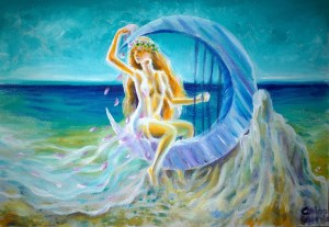 A girl from the isle of lesbos singing playing harp for Sappho and Aphrodite
