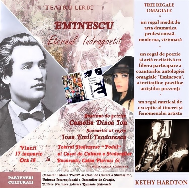 Citeşte mai multVineri a avut loc evenimentul Eminescu, eternul indragostit gazduit de teatrul studentesc Podul de la Casa de Cultura a Studentilor Bucuresti. Un regal de poezie, teatru, muzica si arte plastice, evenimentul a marcat imlinirea a 170 de ani de la nasterea poetului. Din aceasta manifestare culturala au facut parte scriitorul Romeo Tarhon, poeta Liliana Liciu, […]