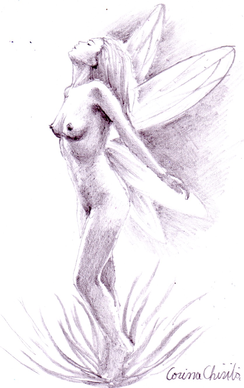 Femeie nud cu aripi inaltandu-se din iarba desen in creion – pencil drawing of a nude fantasy woman Apreciază Încarc...