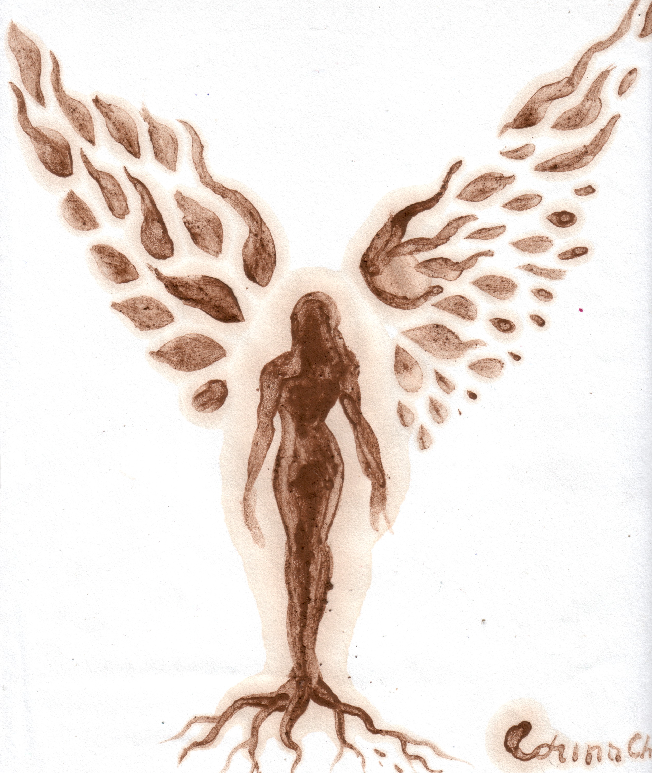 Silueta de femeie cu radacini si aripi pictura facuta cu cafea Silhouette with roots and wings coffee painting Apreciază Încarc...