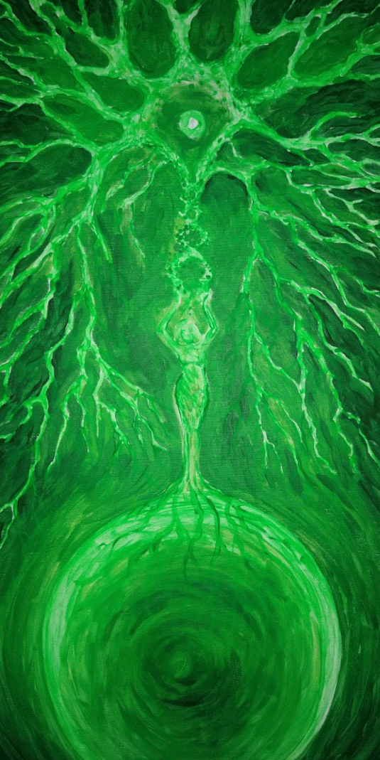 Ea este o zeita. Din talpile ei pornesc radacini ce merg in adancime pana in strafundurile mamei pamant iar din mainile ei inaltate spre cer se ridica un arbore cu crengile intinse spre univers, un arbore ce seamana cu un neuron iar totul este scaldat intr-o lumina verde, lumina vietii. Aceste picturi fluorescente pe care […]