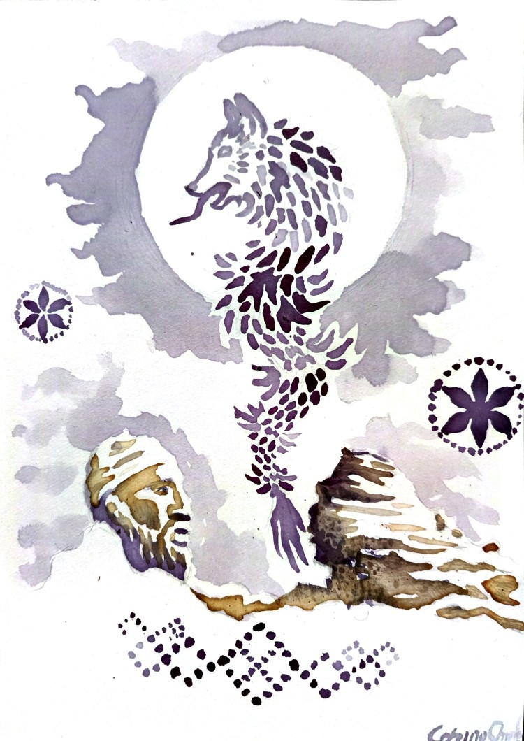 Acum cateva zile am visat aceasta imagine a unui rege dac alaturi de marele lup alb si sfinxul din Bucegi si am realizat doua pictura, una pictata doar cu vin si cafea si cealalta in acrilice pe panza
